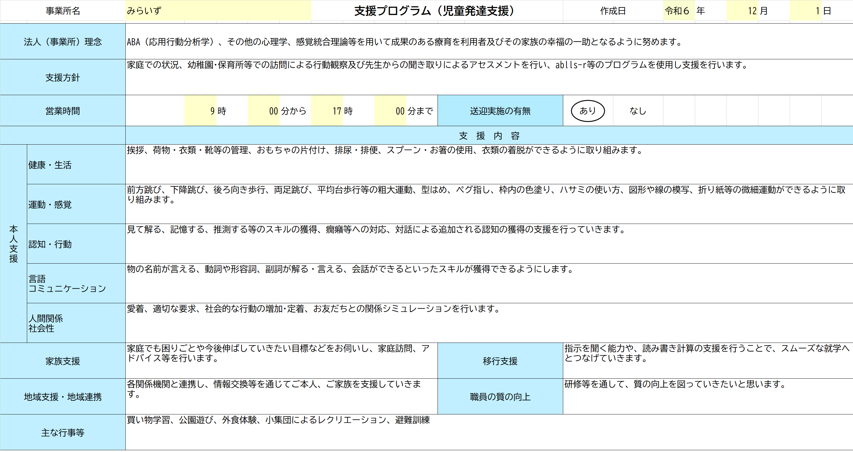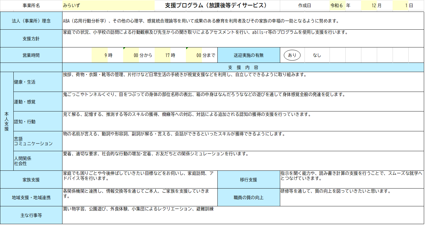 覚」「認知・行動」「言語・コミュニケーション」「人間関係・社会性」)との関連性を明確にした、事業所における支援の実施に関する計画(以下「支援プログラム」という。)を作成し、公表す